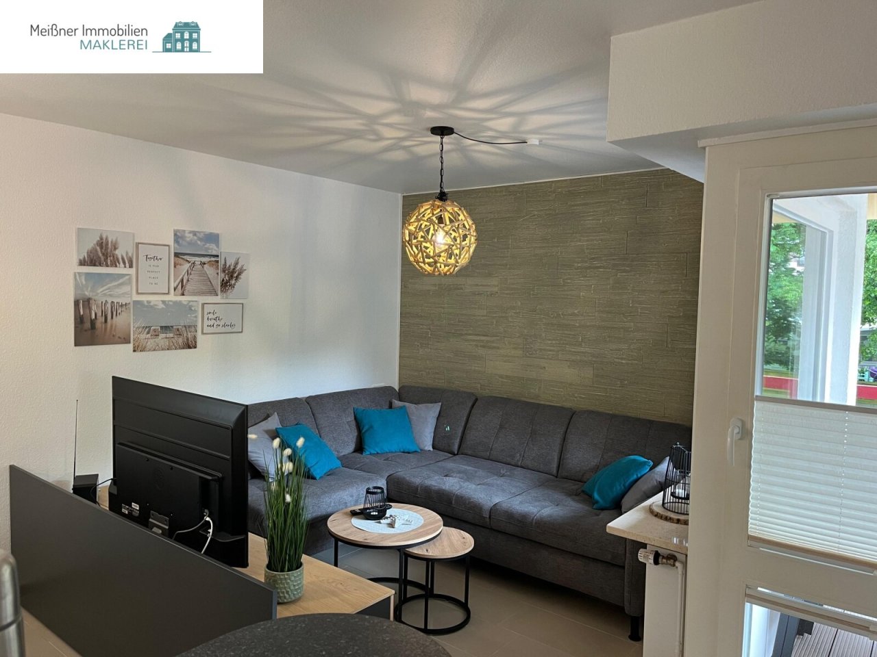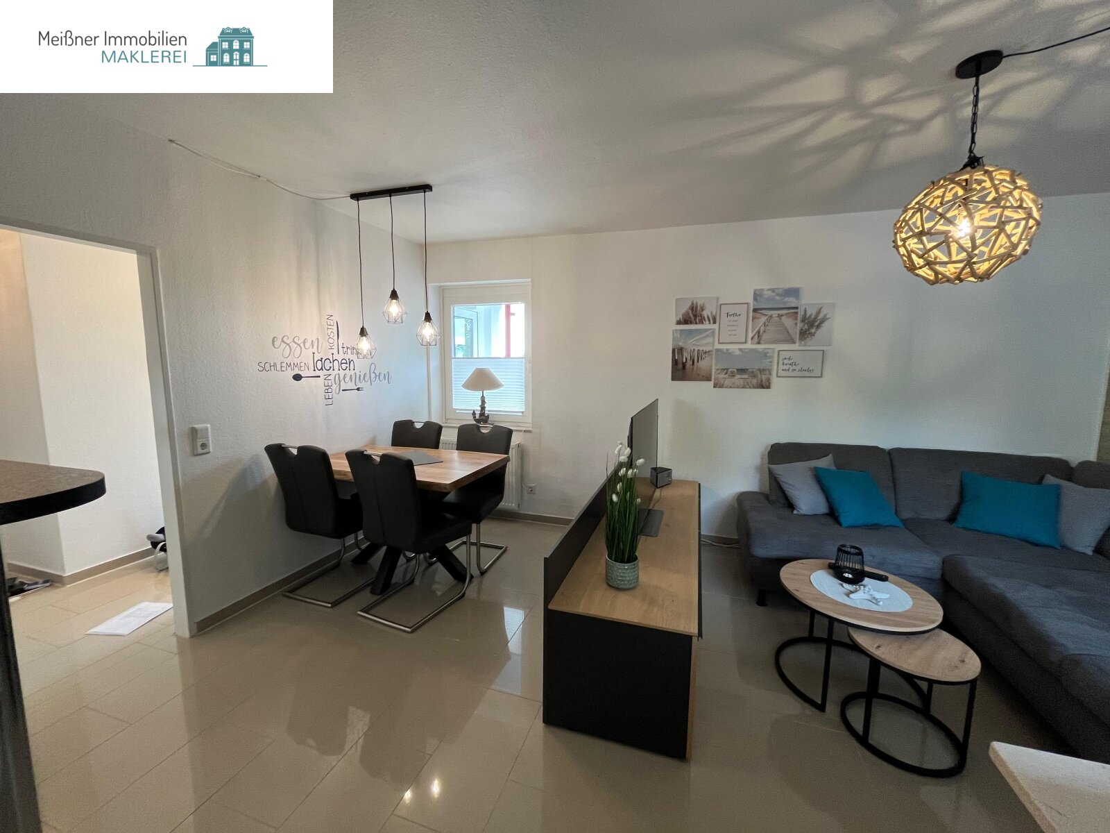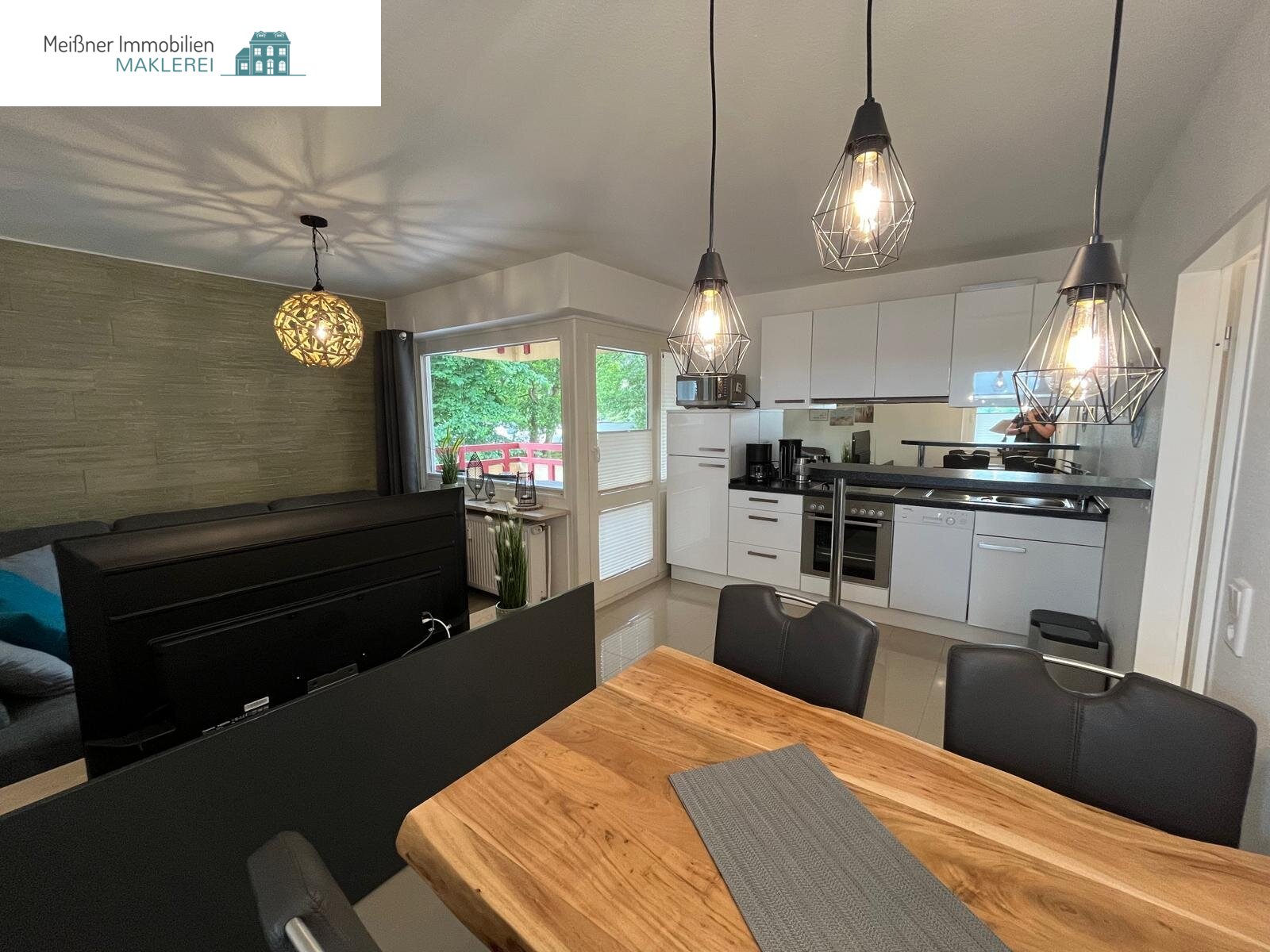 Vom Eingangsbereich führt ein kleiner Flur in das modern und komfortabel eingerichtete Wohnzimmer mit angrenzendem Essbereich und einer schicken, komplett ausgestatteten Einbauküche mit Spülmaschine.