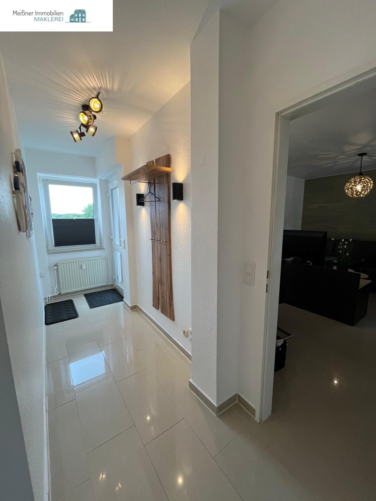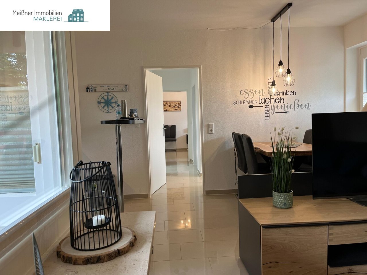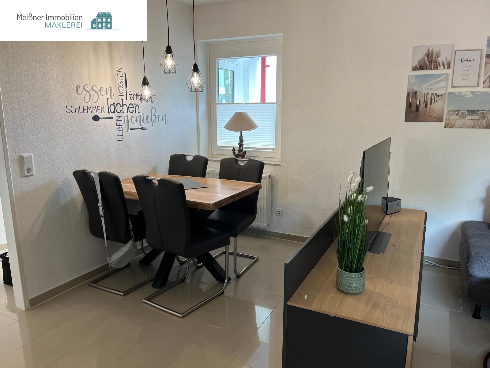 Vom Eingangsbereich führt ein kleiner Flur in das modern und komfortabel eingerichtete Wohnzimmer mit angrenzendem Essbereich und einer schicken, komplett ausgestatteten Einbauküche mit Spülmaschine.