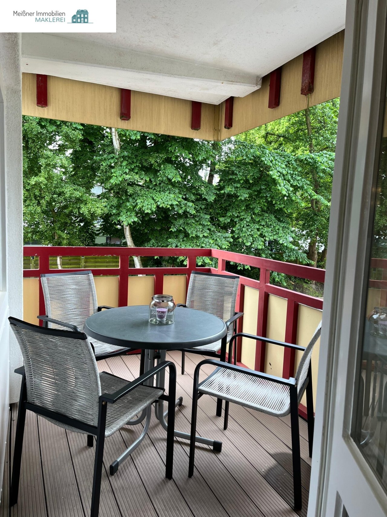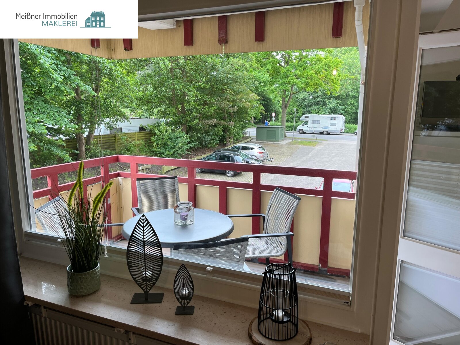 Vom Wohnzimmer erreicht man den überdachten Balkon, der nicht nur bei schönem Wetter zum Verweilen einlädt.